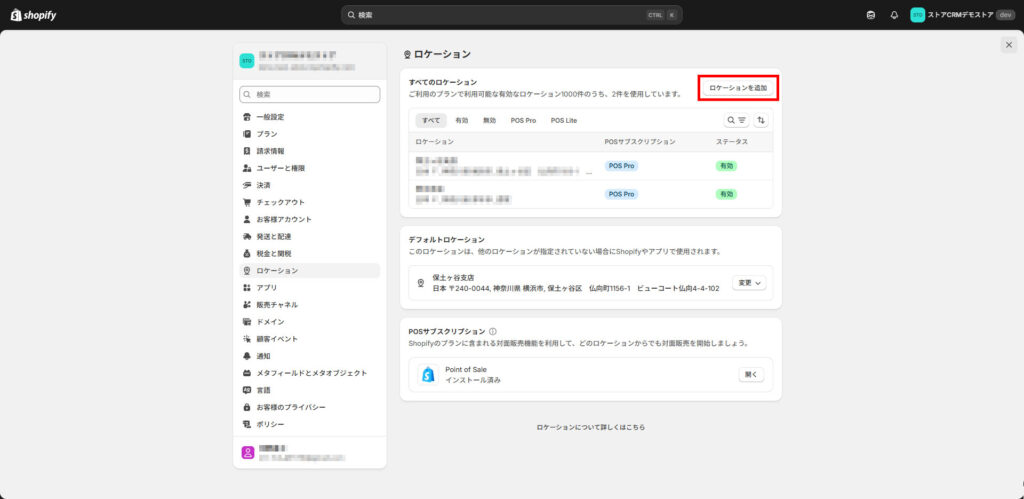 • ロケーションの設定は、Shopify→[設定]→[ロケーション]→[ロケーションを追加]で追加できます。こちらを追加していただくと、freee会計アプリで選択肢が複数表示されます。