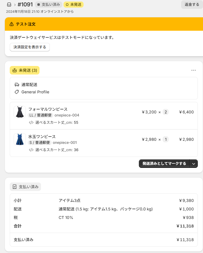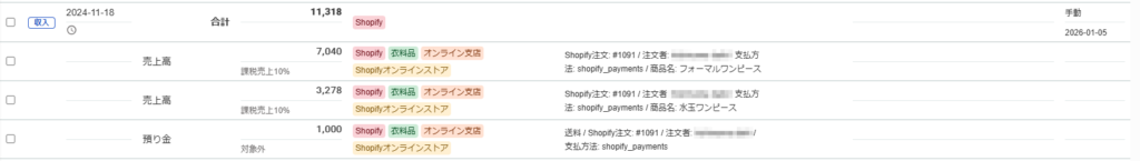 • 例として、Shopifyの注文番号「#1091」に対して2つ以上の商品が購入された場合は、freeeの取引画面で次のように表示されます。